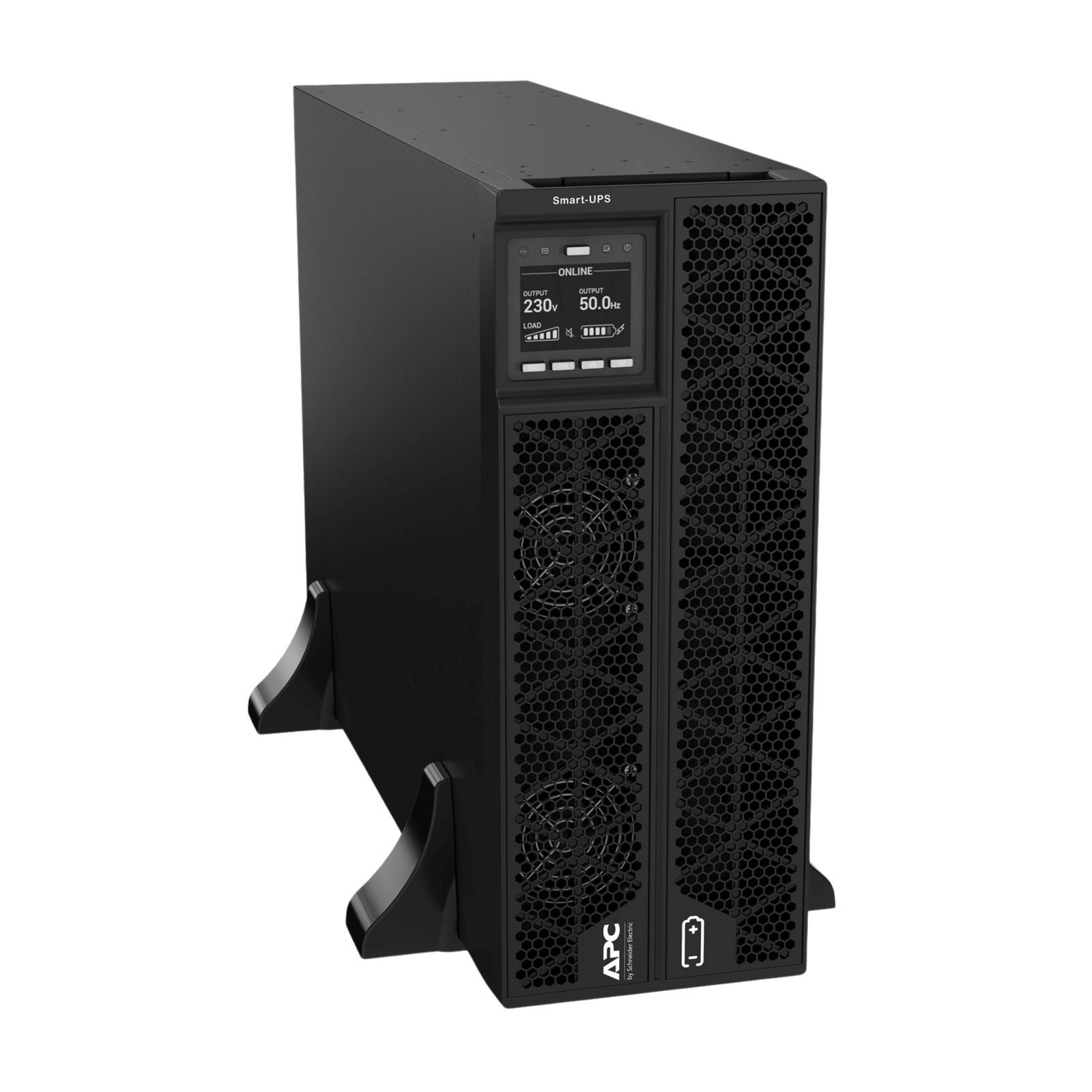 The APC Smart-UPS On-Line 5kVA/5kW – SRTG5KXLI features an intuitive LCD display that presents key operational data at a glance, including input/output voltage, battery status, estimated runtime, load percentage, and system alerts.
